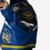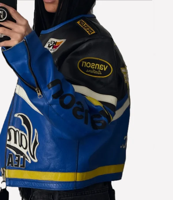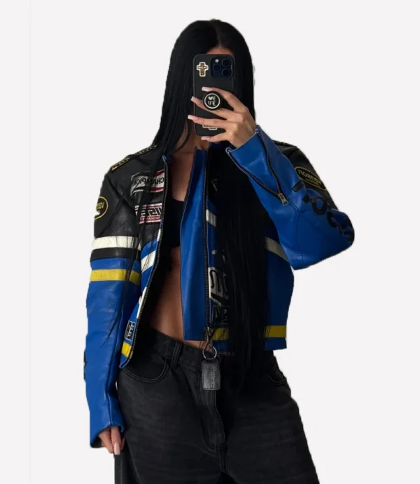 Ride in style with this bold blue and black motorcycle jacket, crafted from durable real leather for a rugged yet refined look. The soft viscose lining keeps it comfortable on the inside, while the classic round collar and smooth front zipper give it a clean, streamlined finish. Zippered cuffs add a touch of edge and functionality perfect for any road-ready adventure or street-style moment.